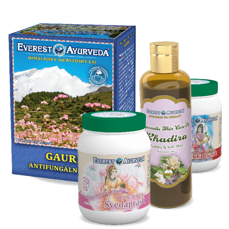Himálajský ájurvédský čaj Gauri: 1 ks, ájurvédský nutriční elixír Raktaprash: 1 ks, ájurvédský očistný elixír Svedaprash: 1 ks, ájurvédský kožní olej: Khadira 1 ks