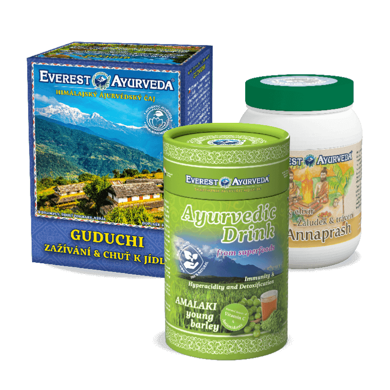 Himálajský ájurvédský čaj Guduchi: 1 ks, ájurvédský očistný elixír Annaprash: 1 ks, Amalaki nápoj Mladý ječmen: 1 ks