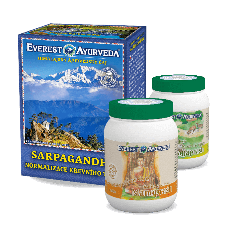 Himálajský ájurvédský čaj Sarpagandha: 1 ks, ájurvédský očistný elixír Manoprash: 1 ks, ájurvédský nutriční elixír Majjaprash: 1 ks