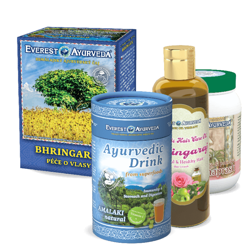 Himálajský ájurvédský čaj Bhringaraj: 1 ks, ájurvédský očistný elixír Keshaprash: 1 ks, Amalaki nápoj Natural: 1 ks, ájurvédský vlasový olej Bhringaraj: 1 ks