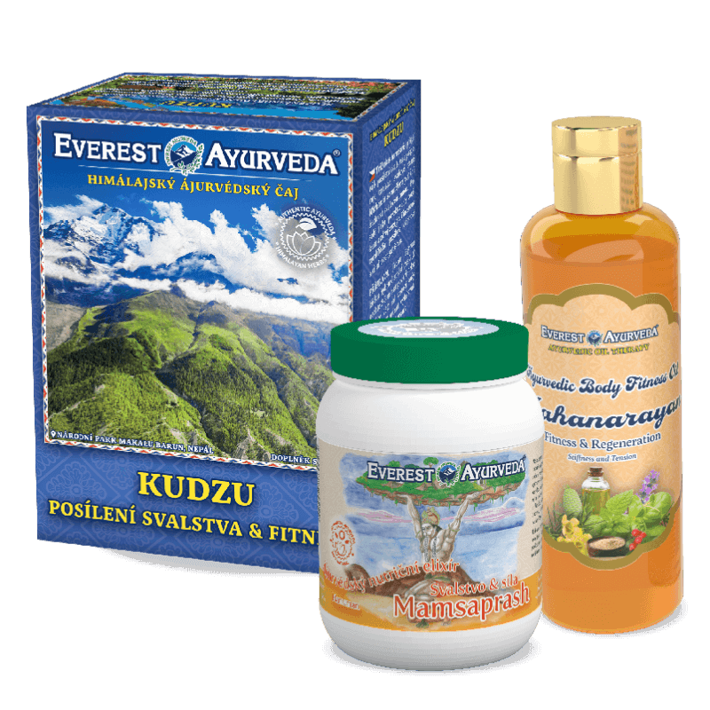 Himálajský ájurvédský čaj Kudzu: 1 ks, ájurvédský nutriční elixír Mamsaprash: 1 ks, ájurvédský masážní olej Mahanarayan: 1 ks